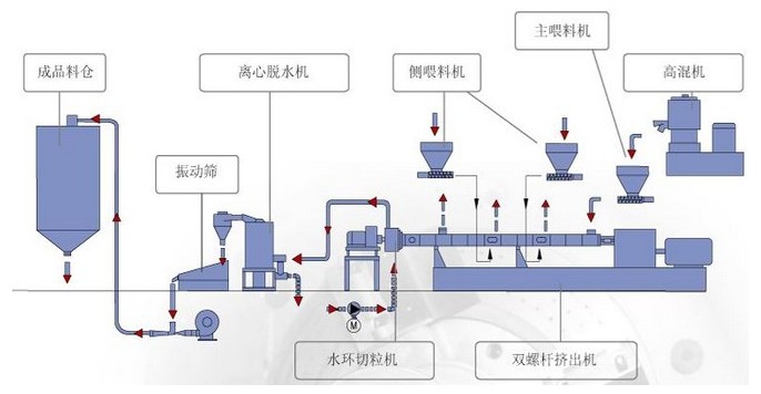 高混機(jī)、主喂料機(jī)、雙螺桿擠出機(jī)、側(cè)喂料機(jī)、水環(huán)切粒機(jī)、離心脫水機(jī)、振動(dòng)篩、成品料倉(cāng)